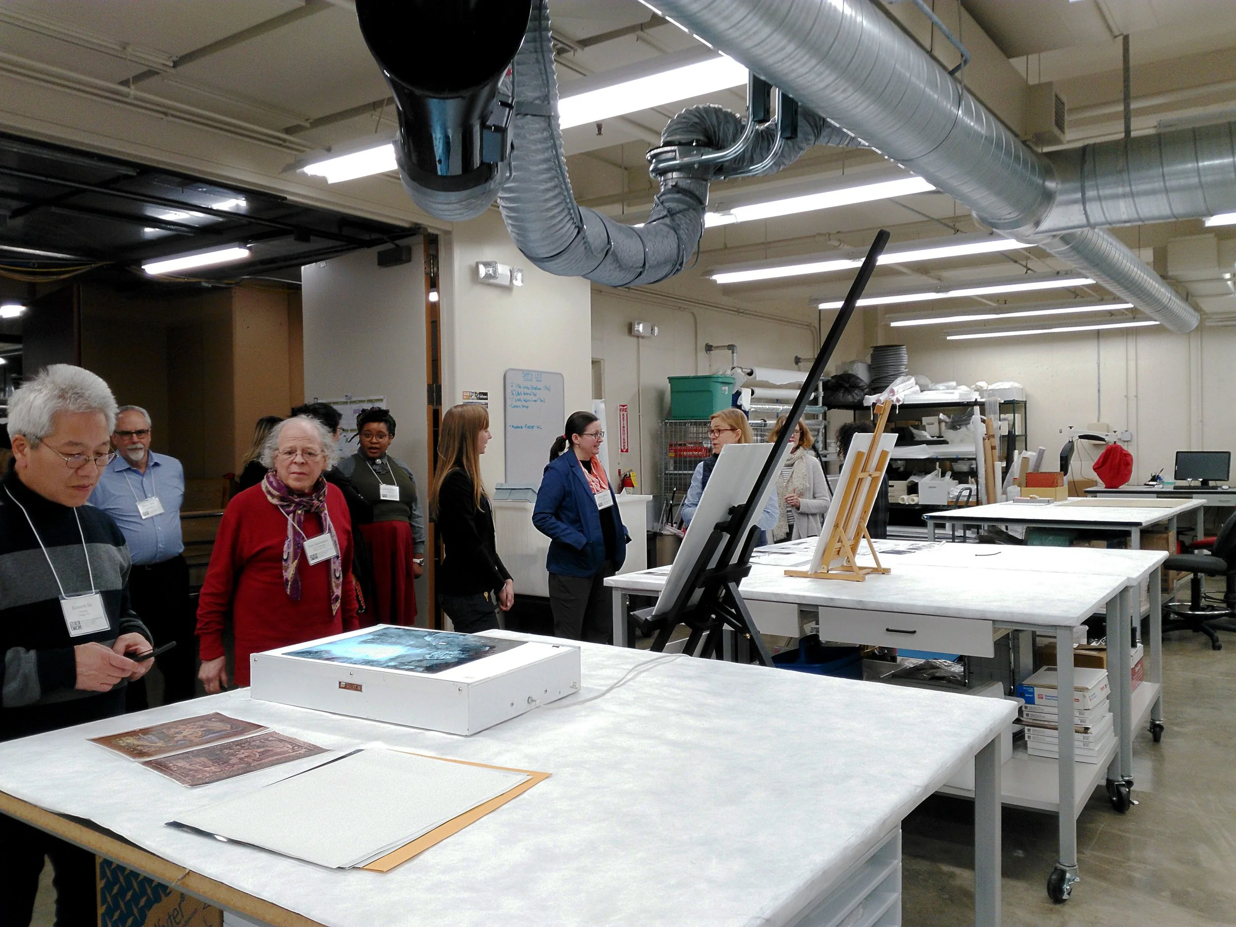 After Mr. Gordon's introduction, MRCG members were divided into smaller groups and brought downstairs on two behind-the-scenes tours. In museum storage, we were able to see collection items such as historic Missourian looms, a dog sledge used on one of Admiral Robert Peary's expeditions to the North Pole, and a 9'x12' hand-carved frame from the Charles A. Lindbergh donation. Upon arriving at the conservation lab, we encountered a variety of objects including an Aztec incense burner, Native American beaded knife sheath and belt, Mexican silver bowl, tortoise shell necklace and pendant, and a steamboat ship model. There were also X-radiographic images from the technical examination of Alfredo Ramos Martinez’s oil on canvas Flores Mexicanas, which will be featured in an upcoming exhibition at the Missouri History Museum.